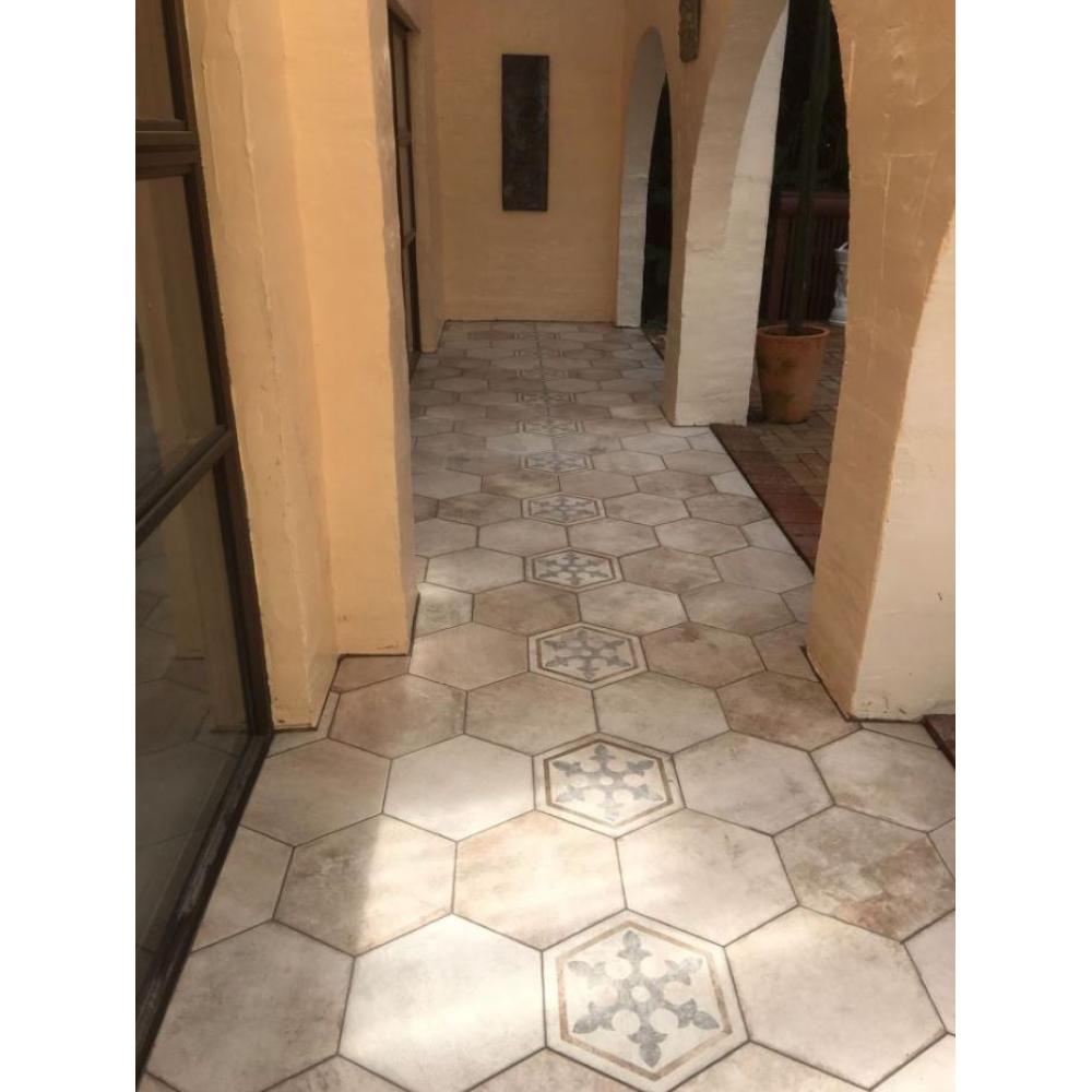 +36 1 336 2080Klasszikus mintával és kopottas, antikolt felülettel gyártott, régies cementlap jellegű hatszögletű gres padlóburkolat, melyet vintage hatása miatt betervezhetünk klasszikus mediterrán, country enteriőrbe, de modern, loft stilusú nappaliba, konyhába, étkezőbe vagy előszobába, előtérbe, teraszra is kiváló, szép megoldás.