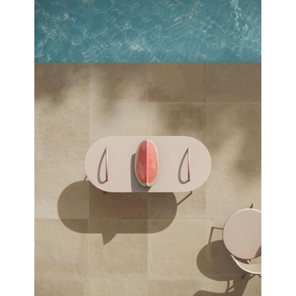 R10-es csúszásmentes felület, de rendelhető ebben a méretben R11-es felület is, mely lehetővé teszi, hogy a beltéri burkolatot a teraszon is folytathassuk vagy akár akültéri medence mellé burkoljunk egy nagyon érdes felületű fagyálló lapot, mely biztonságos.