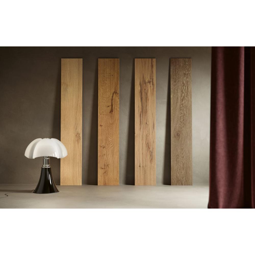 A fa meleg és meglehetősen egységes tónusa természetes hatású csomókkal, szöglyukakkal és erősen kontrasztos repedésekkel egészül ki, amelyek antikolt megjelenést kölcsönöznek ennek a HD technológiával készült greslapnak.