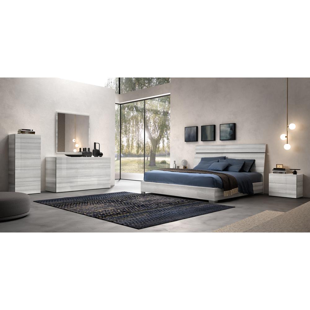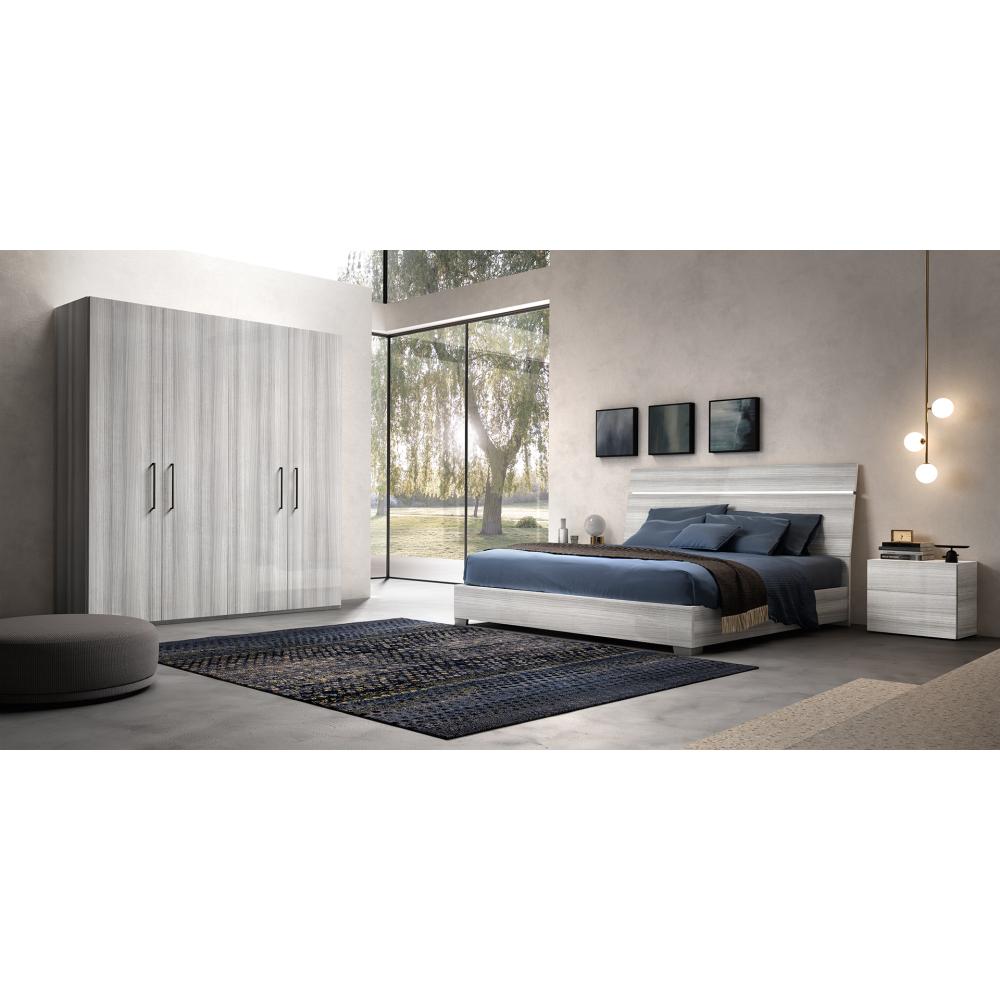 ST1 Exkluzív franciaágy, világosszürke eukaliptusz magasfényű felülettel, bőrkárpitozással, led világítással / 154 x 203 cm /