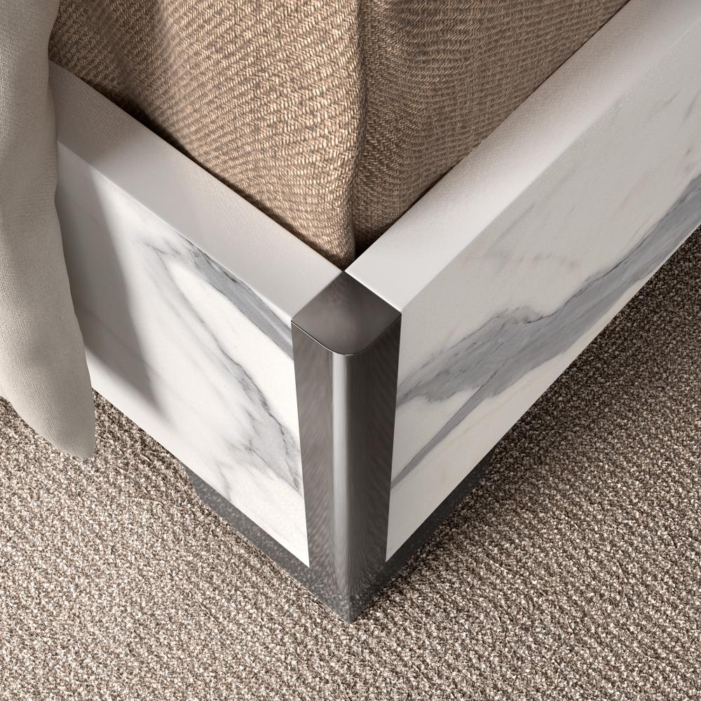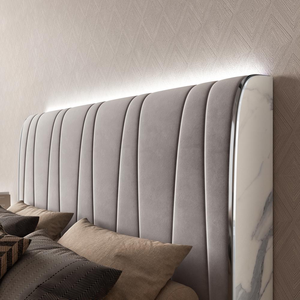 Színe: fehér márvány, magasfényű felülettel, króm lábazattal, bézs színű kárpitozott fejvéggel. A kárpitozott ágyfejvég, rejtett led világítással szerelve.